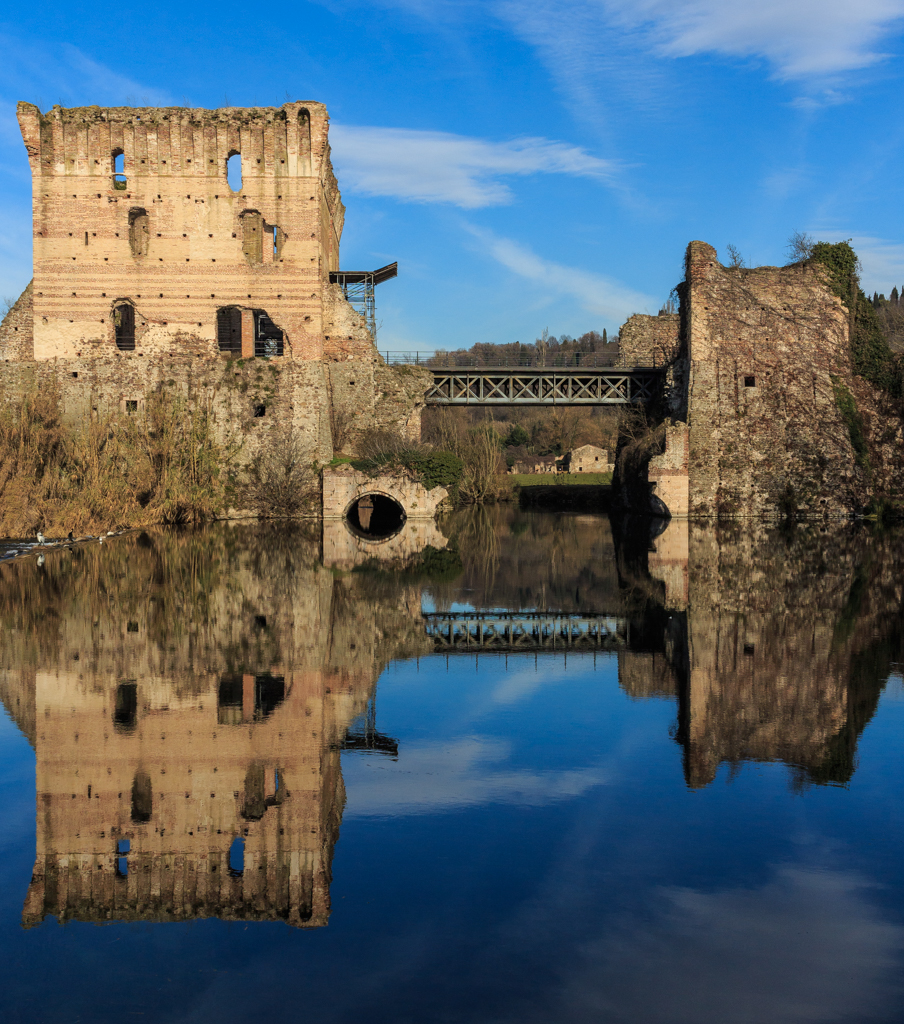 Veduta del ponte visconteo sul Mincio nei pressi dell'abitato di Borghetto di Valeggio sul Mincio.