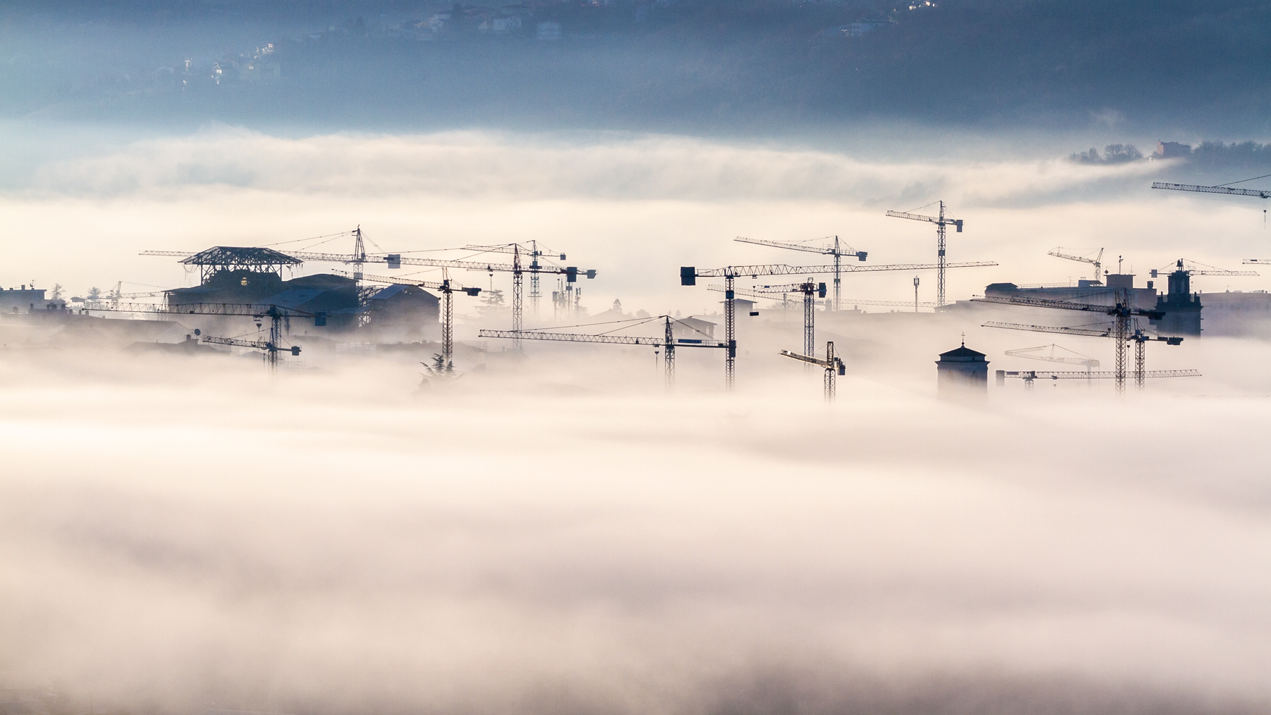 Bella la ripresa di queste gru spuntando dalla nebbia che si innalzano nel cielo..