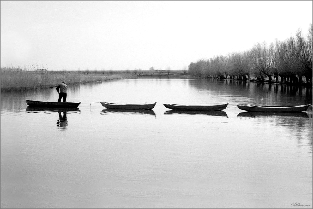 ma che bella questa sequenza di barche ordinata e silente...e l'uomo le conduce con religiosa maestria come un buon pastore conduce il suo gregge.