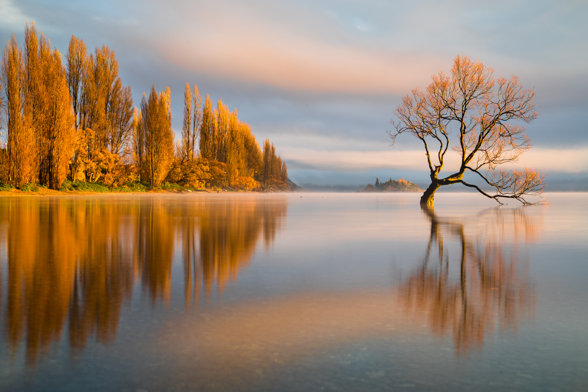 Vi voglio confortare: ho molte foto dell'albero in tutte le posizioni, questa è semplicemente quella con la luce migliore. Per scattare la foto sono rimasto immerso per due ore nelle acque gelide autunnali fino alla pancia per avere l'inquadratura migliore. Questa luce è durata solo per due piccoli scatti. Ne ho altri con un'atmosfera diversa, più cupa e probabilmente non meno bella, ma questa ha i gloriosi colori del maggio neozelandese, in tutta la sua potenza