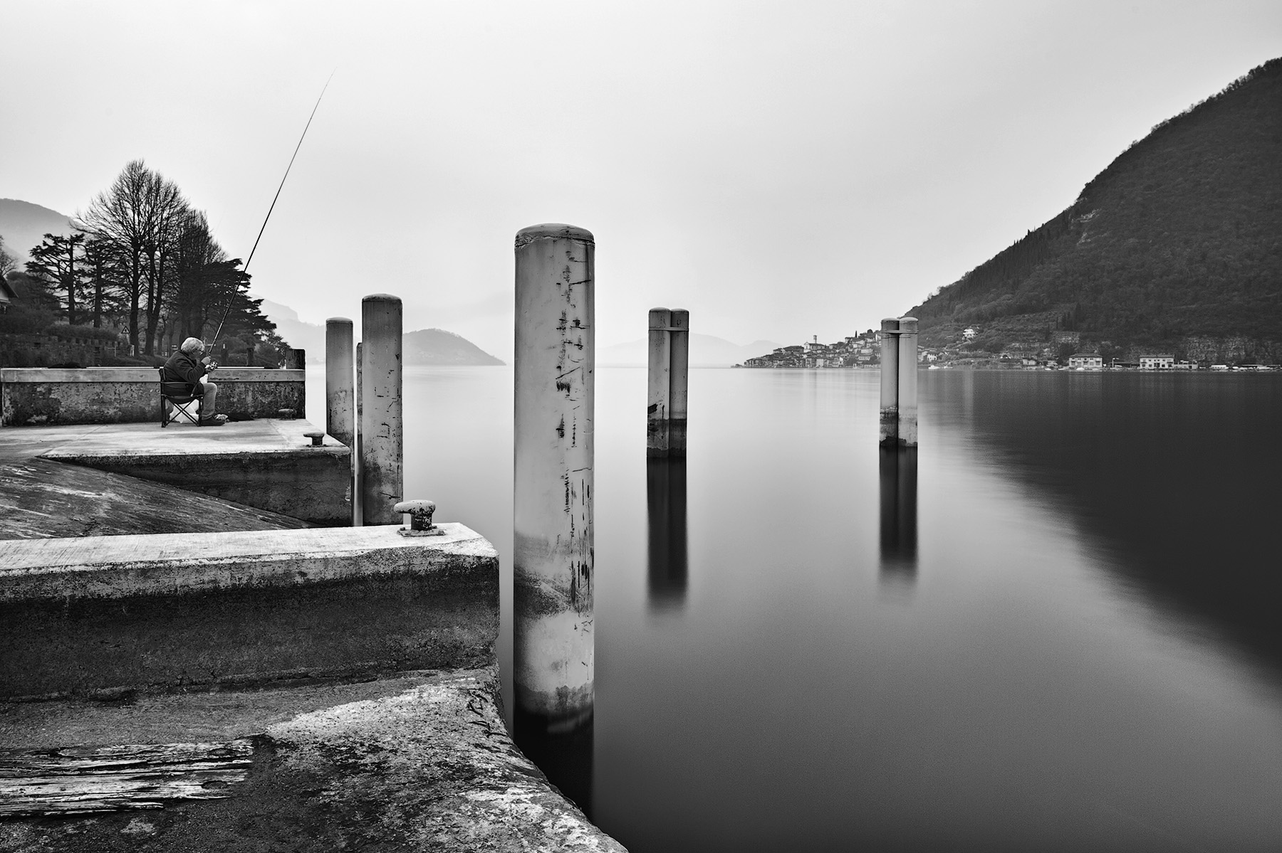 Un bel bn,ricco e luminoso,scandisce una scena pulita, in cui i vari elementi creano piacevoli richiami geometrici che impreziosiscono questo scorcio. Mi piace molto come il promontorio che scende verso l'acqua e il suo riflesso, creino una ''freccia'' che va ad equilibrare bene la parte dx del frame con la più ricca parte sx. Il pescatore e la sua pazienza, la sua calma ( e il suo star fermo così tanti secondi la dice lunga!) son un piacevole inserimento,protagonista discreto e non invadente. Solo il titolo sai non lo ritrovo poi tanto, ma è un interpretazione personale, non so, magari lo era, ma la sensazione di giornata uggiosa non mi arriva. Mi piace molto  _________________
