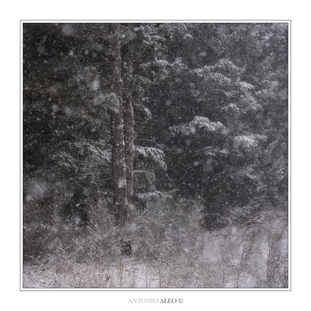 Non c’è nulla da fare ma è così. Tante volte il fatto che ci si soffermi troppo su elementi quali costruzione, spazi, posizione dei vari elementi colori o B&N ecc. sembra un’inutile pedanteria ma, immancabilmente, questi elementi costruttivi plasmano l’immagine e quello che riesce ad esprimere e comunicare. Non c’è nulla da fare, se immaginiamo un’idea fotografica ottima, essa sfocia in risultati molto differenti se è realizzata con tutti i crismi o se la realizzazione risulta raffazzonata ed a spanne. Partendo dalla stessa idea e soggetto da dieci e lode si hanno due immagini con bontà ed efficacia molto molto diverse. In particolare con una capacità opposta di esprimere un’idea e di risultare efficaci. Ma bando alle ciance, questa fotografia, secondo me, ha tutto al posto giusto. Il formato quadrato ci sta benissimo, compatto e chiuso e simmetrico racchiude un insieme di alberi, rami che formano una sorta di trama che riempie tutto il fotogramma. Niente colori, ma semplicemente una texture che viene esaltate dal B&N. E poi la neve, nel paesaggio ma soprattutto balza all’occhio il suo cadere reso efficacemente con i fiocchi fuori fuoco che riempiono la scena. Per me molto bella.