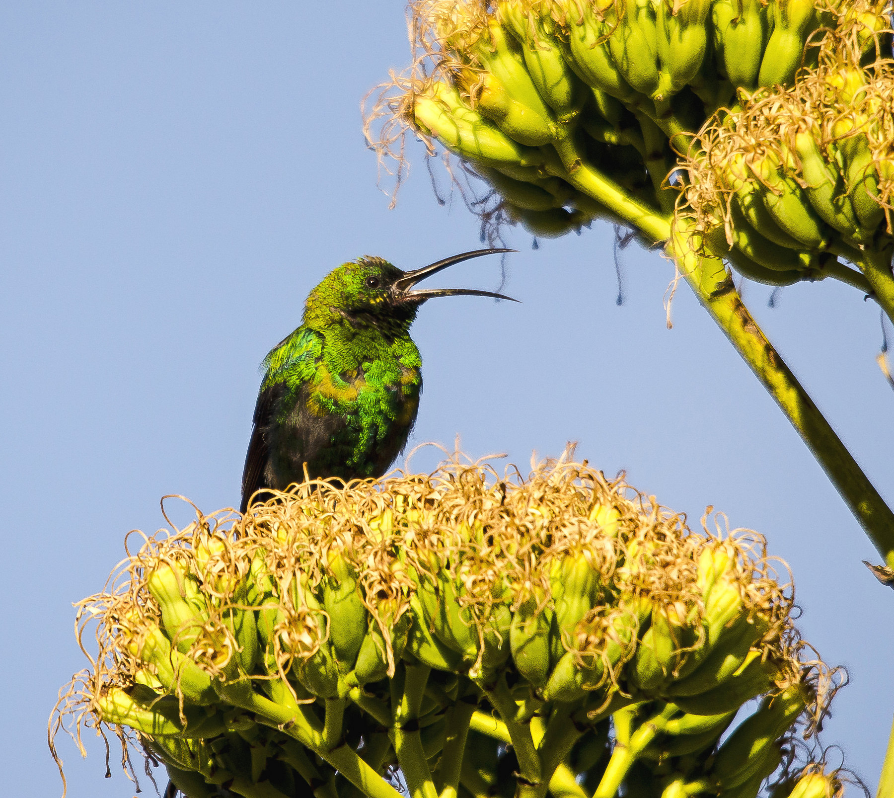 Qualcuno sa di che uccello si tratta? Siamo in Sudafrica e stava succhiando il nettare ma posato sul fiore e non in volo come un colibrì.