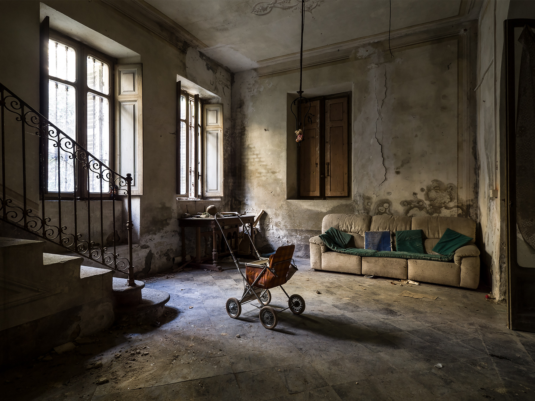 questo scatto in fondo viene immortalato un locale di una costruzione abbandonata. Balza subito all’occhio che si tratta di un’abitazione di un certo livello: locali ampi, soffitti alti e decorati intorno al lampadario, decorazioni lungo gli spigoli dei muri. Nobiliare? Potrebbe essere…senza dubbio di una certa borghesia di qualche anno fa. Se ne sono andati…magari qualche evento imprevisto o una decadenza finanziaria. il passaggio da un certo tenore di vita ad un altro diverso. Il locale sembra testimoniare un abbandono veloce ma non repentino. E’ abbastanza vuoto, salvo un divano che forse era eccessivamente ingombrante da portare via ed inadatto alla nuova abitazione. E qui’ iniziano le domande senza risposta, dettagli inspiegabili: ma perché lasciare i cuscini sul divano? e il tavolino…cosa c’è sopra? Perché sono rimasti li? E poi il dettaglio più inquietante: un passeggino? Allora di fuga si è trattato o di una partenza repentina….no dai, il passeggino non serviva e l’hanno lasciato li per caso. Davvero…ma si’….ma una sensazione di inquietudine velata rimane. Questo emerge guardando la fotografia e soffermandosi un poco su di essa.