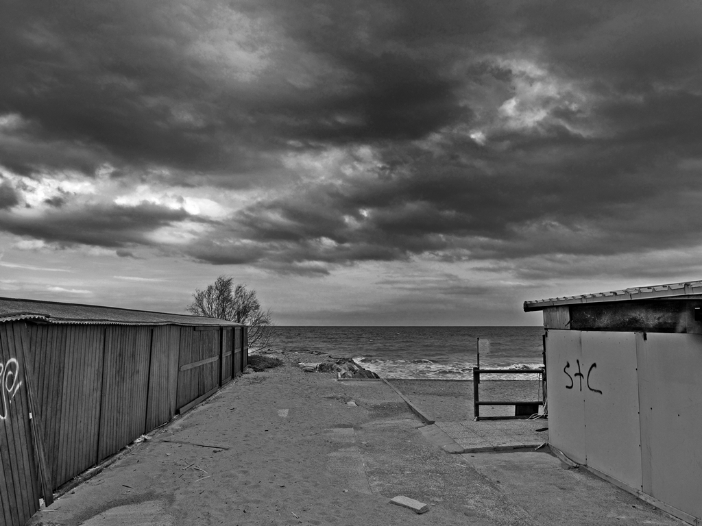 affascinante questo mare d'inverno con la spiaggia deserta e le nuvole minacciose che incombono sul mare, mi piace