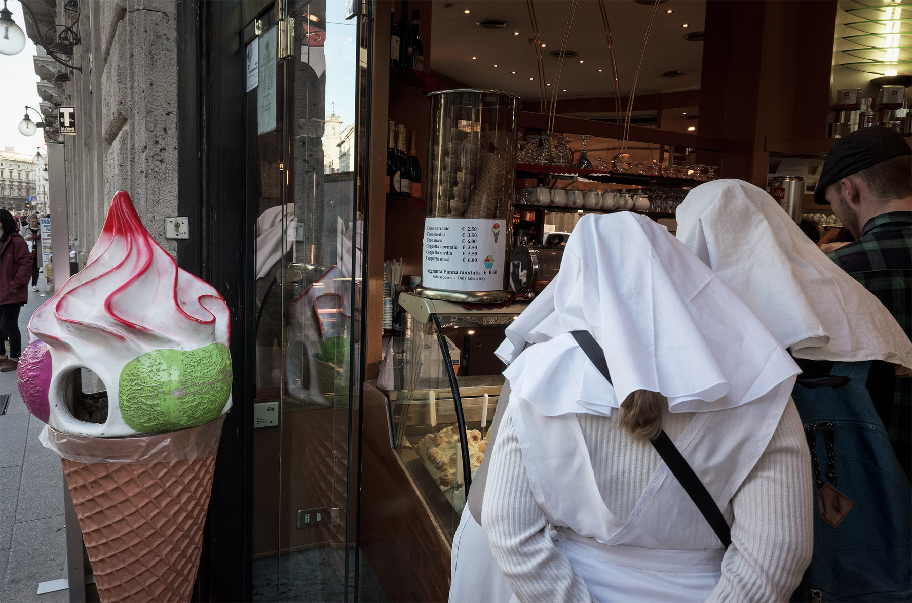 Il mio occhio viene catturato dalla coda di cavallo della suora, e ci vedo pure una connessione con il gelato a sinistra..  |