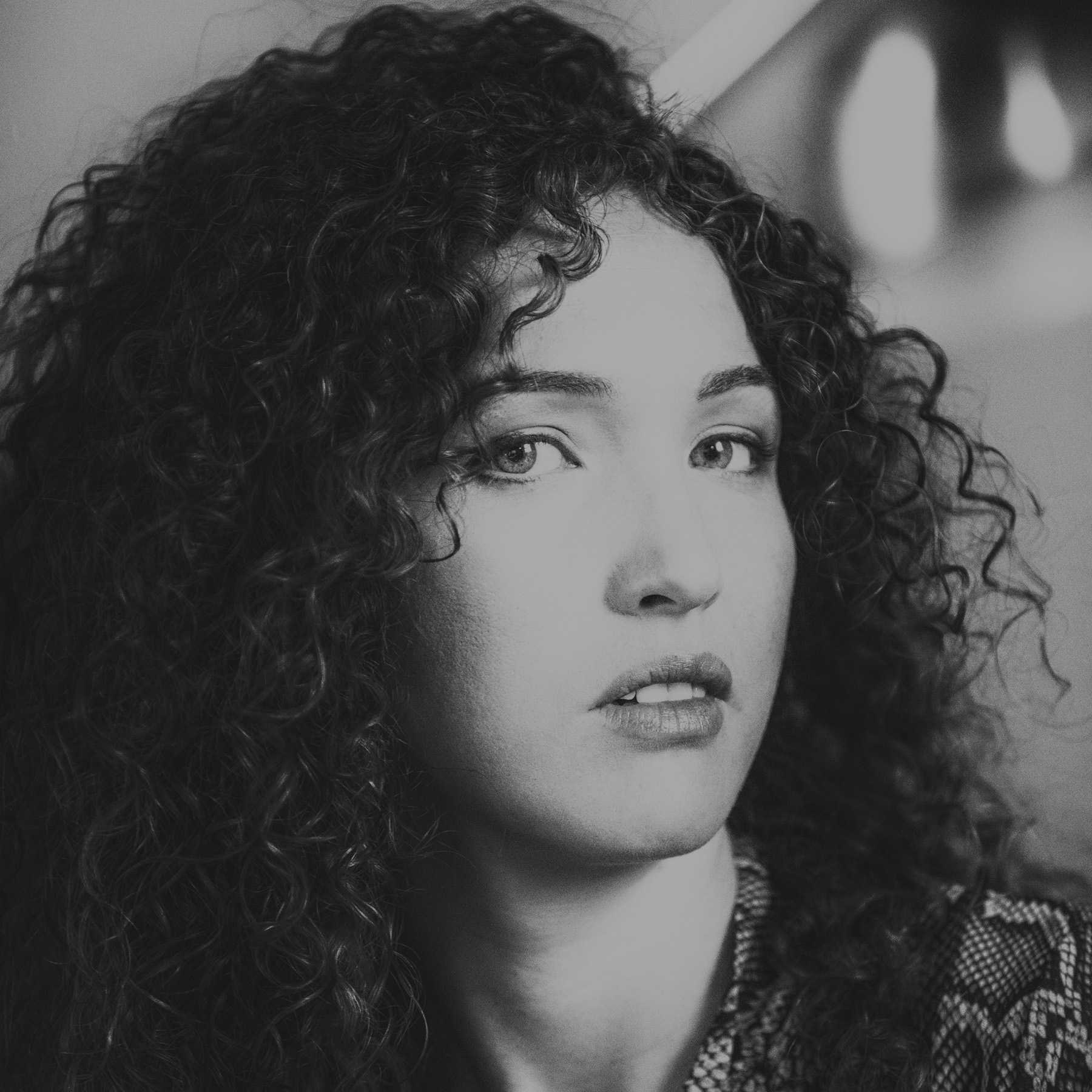 Mmmm sai io trovo alcune cose che mi piacciono e altre che mi convincono meno. Mi piace l'espressione enigmatica, per certi versi profonda e curiosa e per altri molto chiusa,ma che trasuda sensualità, riuscendo ad apparire molto disinvolta davanti all'obiettivo. Mi piace la resa delicata del bn, mentre non mi convince la resa della pelle che alterna delle parti che sembra quasi di poter toccare ,con altre,quelle più luminose, dove si va a perdere quasi ogni dettaglio. Anche lo sfondo in una ripresa così stretta forse mi sarebbe piaciuto un pochino più omogeneo . Ciao