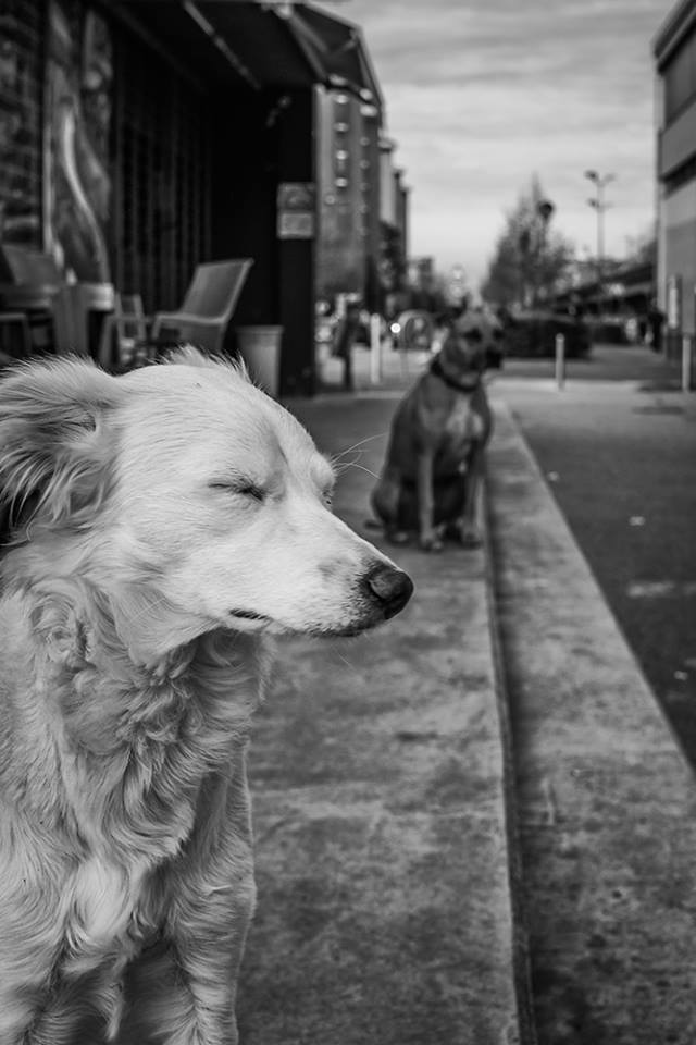 Molto bello lo sfocato che permette di cogliere il cucciolone sul retro e simpatica l'espressione colta del quadrupede in primo piano, direi quasi umana: chissà cosa gli sta passando per la testa.