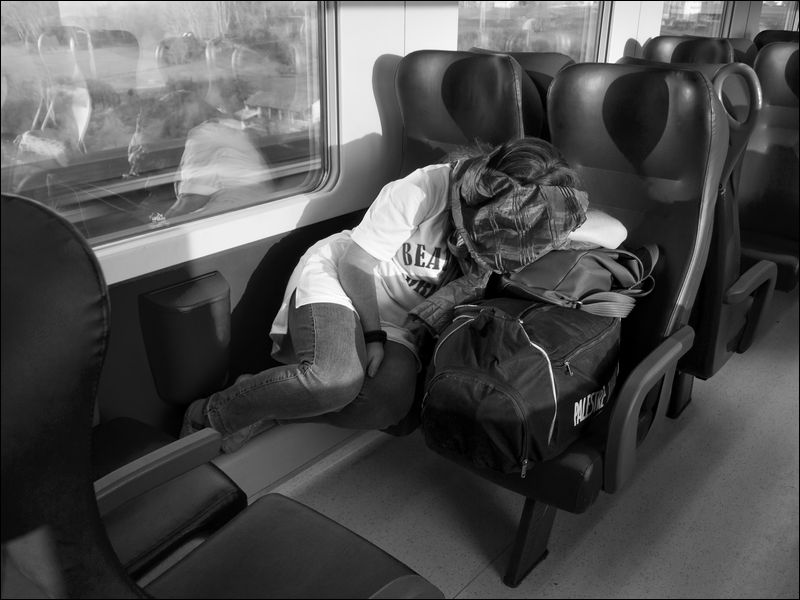 La dura e stancante vita del pendolare... ben ritratta in questo scatto rubato. Curioso il volto coperto dal giubbotto, rende tutto più interessante. Bello il taglio a includere anche il riflesso e senza elementi estranei..  _________________ There is a crack in everything. That’s how the light gets in. [Cohen] |
