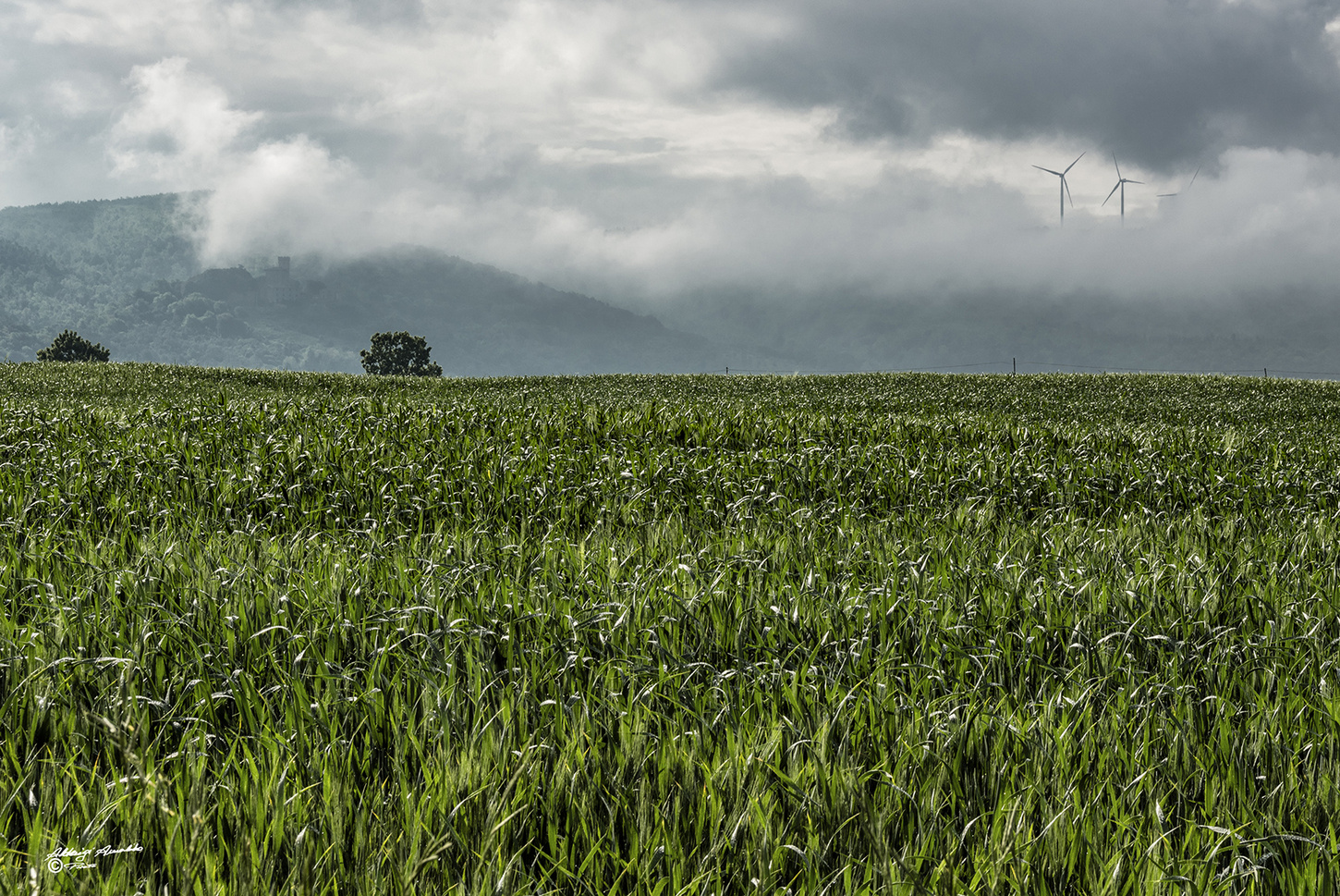 Fantastiche quelle pale eoliche che spuntano tra le nubi!Bellissima immagine,grande profondità e notevole il contrasto tra il verde vivo dei campi ed il quasi monocromatismo del terzo superiore.Complimenti! Buona domenica,Sergio.