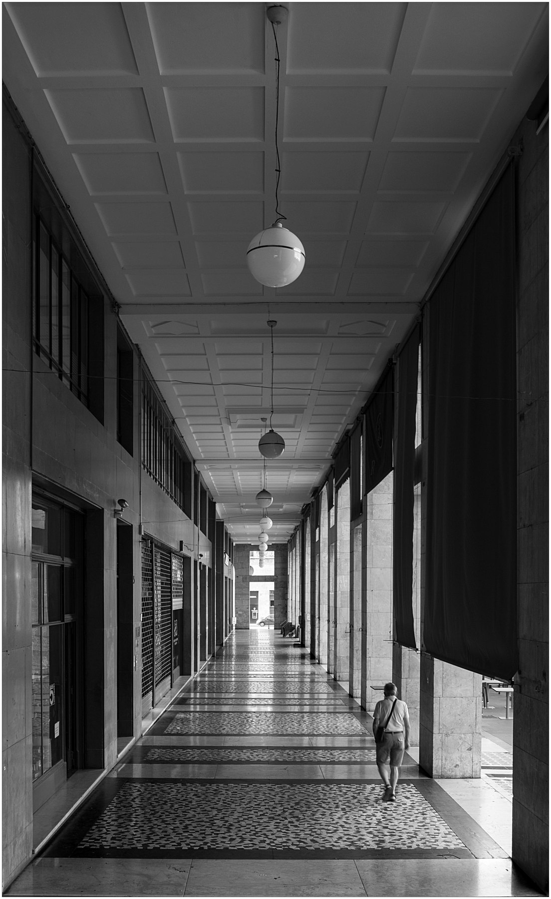 Ottima fuga di colonne,lampadari... con l'inserimento della figura umane sotto questo loggiato ben ripreso e proposto in B/N.. Ok! Ciao