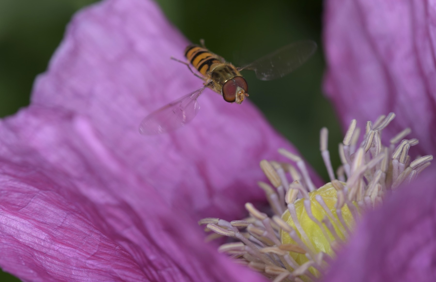 Un Sirfide in volo verso il nettare del fiore...buona la maf.