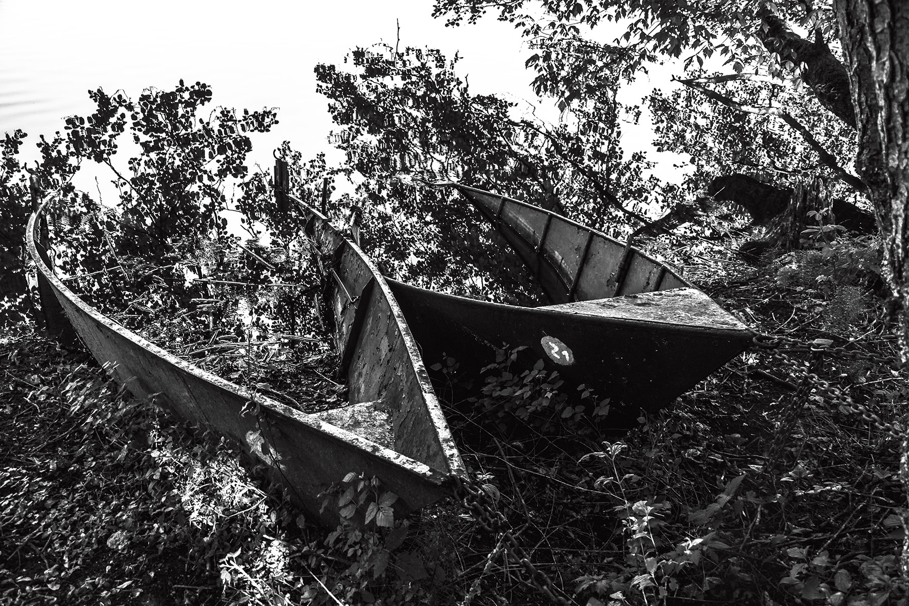 Le chiglie semi affondate si fondono nella poppa con il riflesso nell'acqua immobile creando un grafismo davvero efficace.