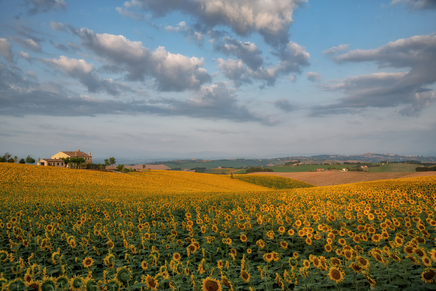 Molto bello questo paesaggio collinare,a perdita d'occhio immerso nei girasoli..il casolare sulla Sx fa un ottima composizione di questo scatto..