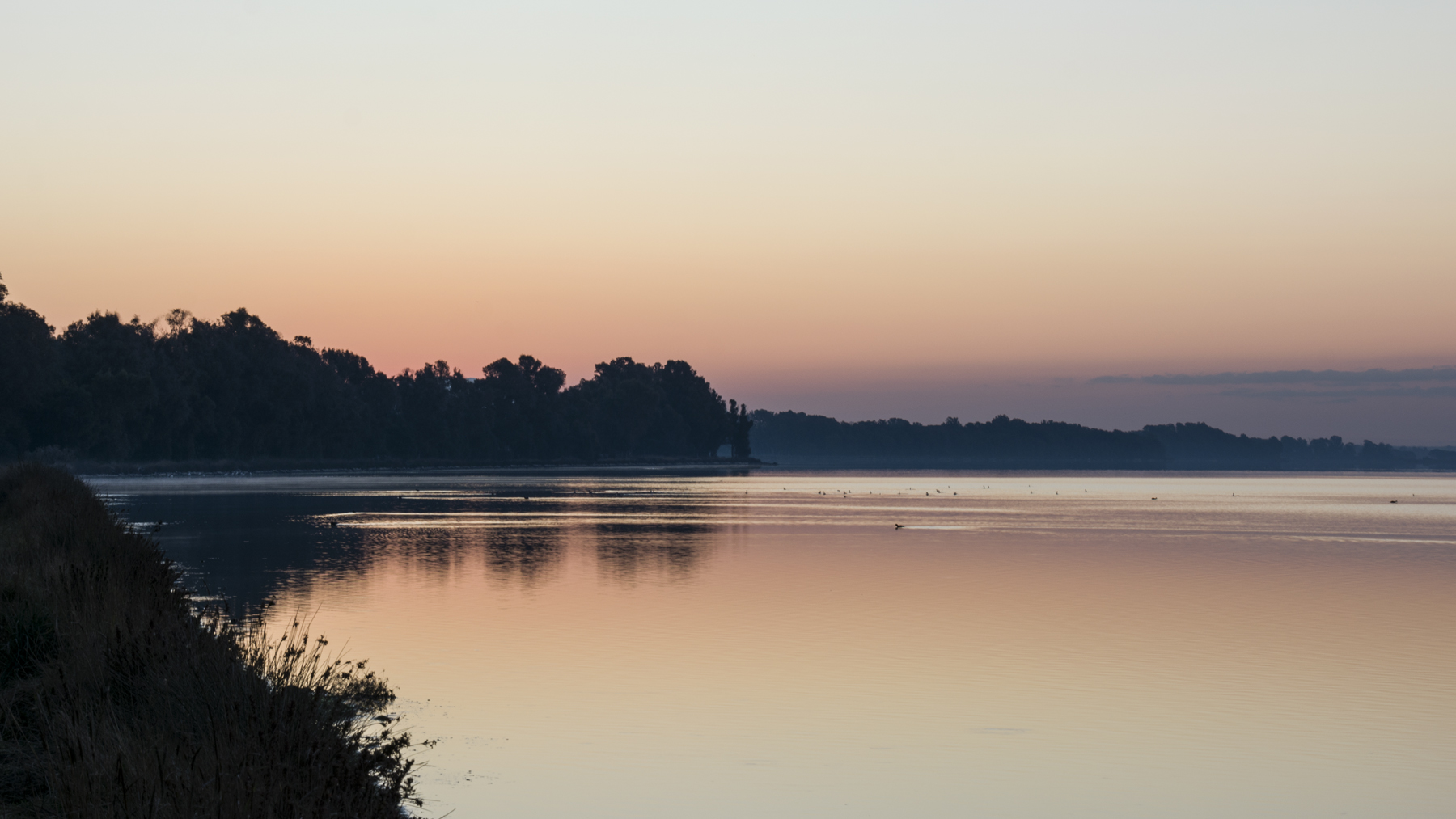 Un tramonto piacevole sia nei colori che nella veduta di acquatici, tranquillamente svolazzano in questo lago..piacevole anche quel piccolo tunnel che si intravede nella punta centrale..Ottima proposta.