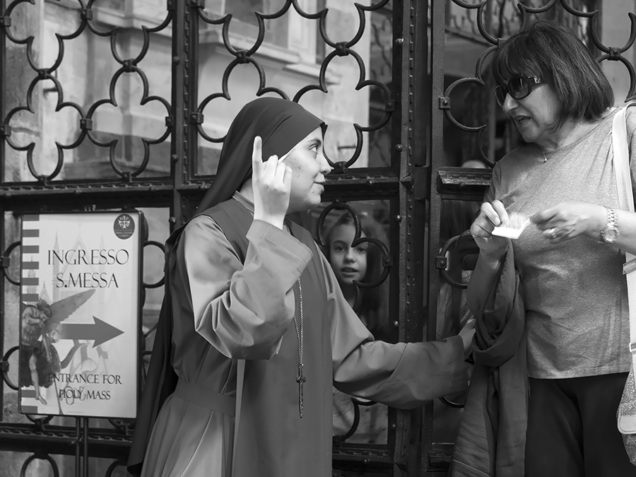 Le espressioni valgono il bglietto ma la freccia del cartello che si prolunga attraverso il braccio della Serva di Dio verso l'Altissimo a me pare la chiave di lettura. magari sono fantasiosa ma tant'è