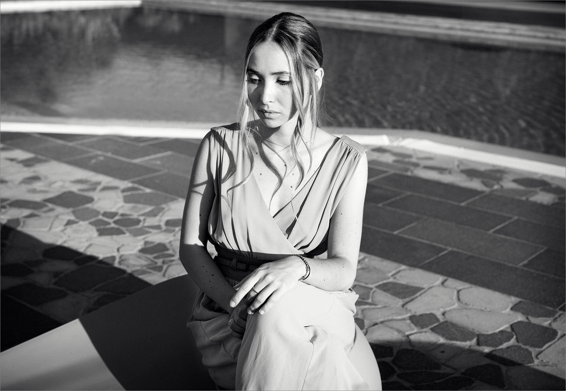 Malinconicamente penseriosa... estremamente elegante e sofisticato questo ritratto.Luce non semplice ma molto ben gestita e perfettamente in linea con le sensazioni che evoca guardarla. Un bn morbido , pulito, fa da complemento perfetto.Forse solo un po le linee della piscina in alto creano qualche disturbo ma è poca cosa. Proposta di alto livello,molto bella Ciao