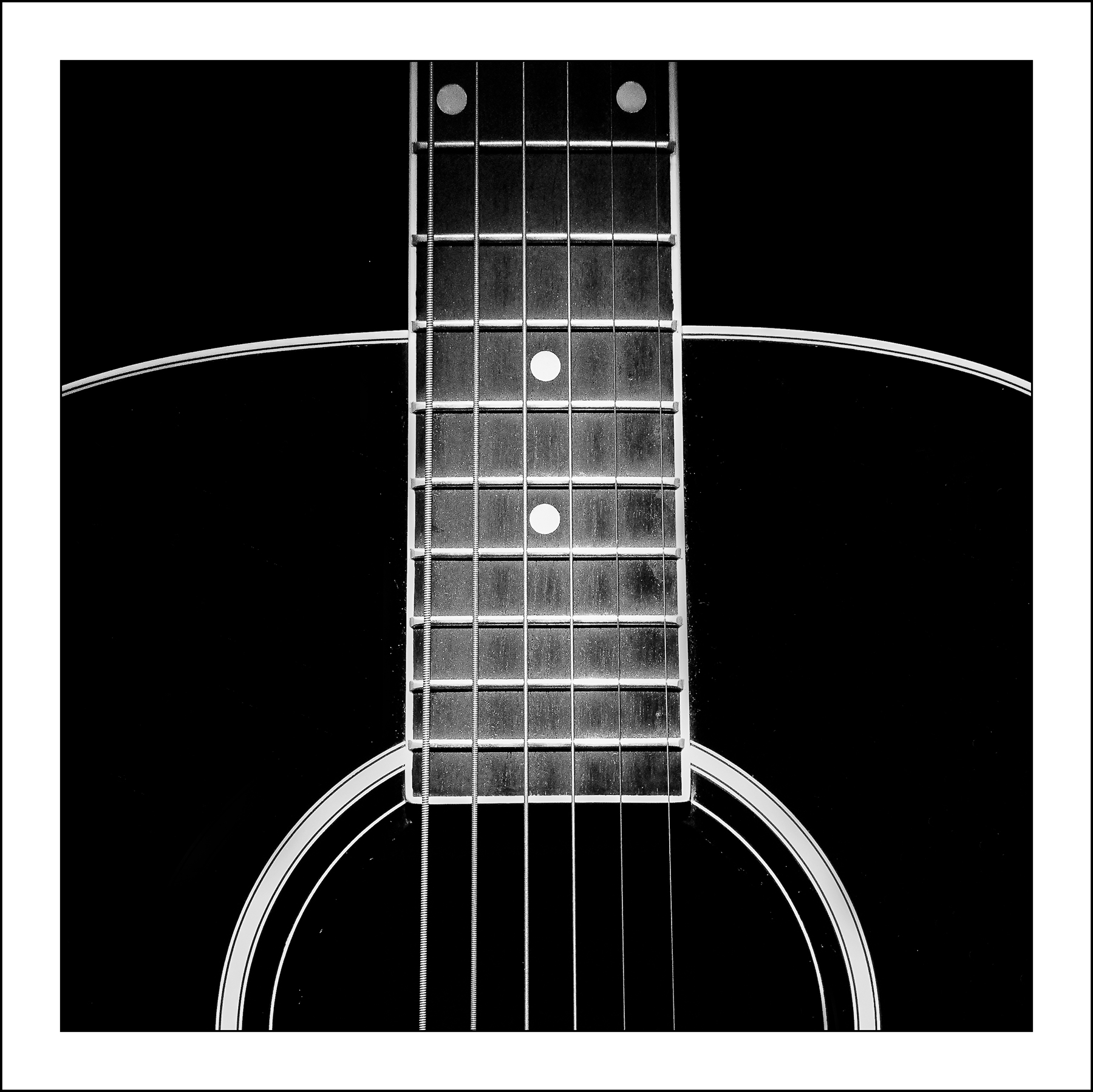 La chitarra è nera a specchio, lo sfondo di velluto nero e la stanza al buio con unico punto luce un proiettore laterale.