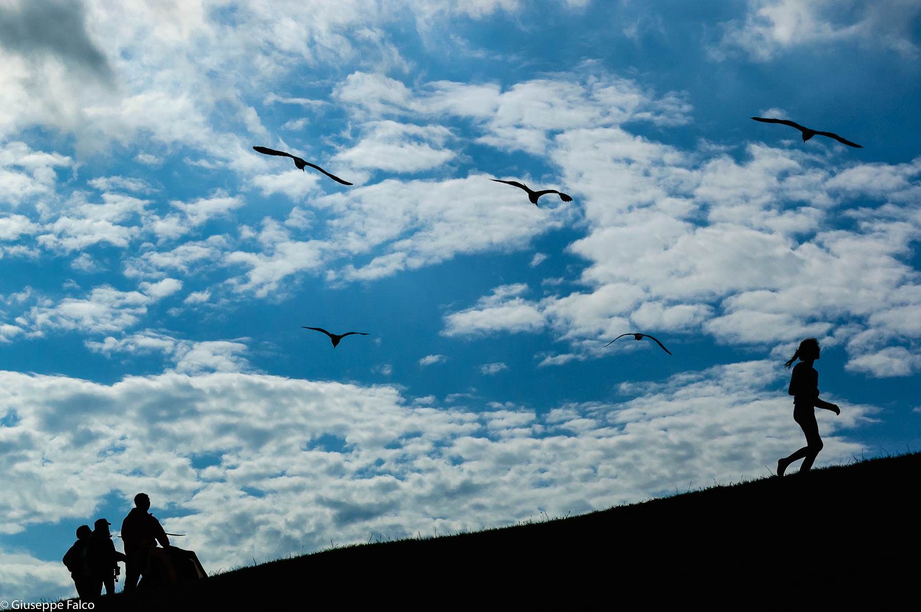 Una foto che trasmette un gran senso di libertà. La salita la ragazza, il volo degli uccelli. Le figure a lato sx sono in più ma la loro inclusione permette di avere una porzione di cielo più ampia.