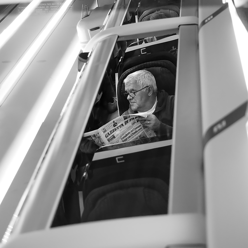 Treno FrecciaRossa. Riflesso dei passeggeri sul portabagagli sopra le teste!