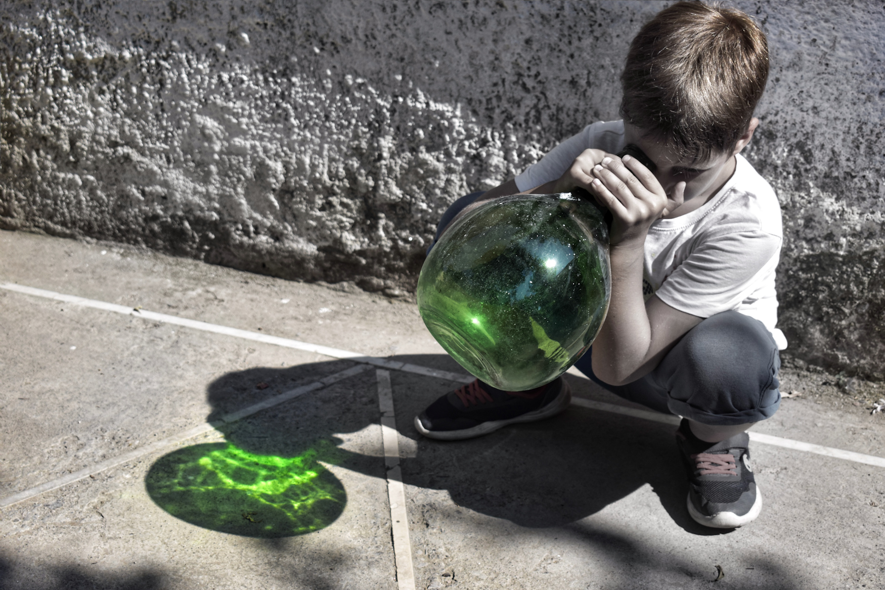 Curiosa,giocosa ,perfino un po'magica...mi piace il momento e tutti i significati raccolti nel gioco di un bimbo..Solo mi stranisce il colore dell'incarnato,non so l'effetto grigiastro non mi fa impazzire perdonami...