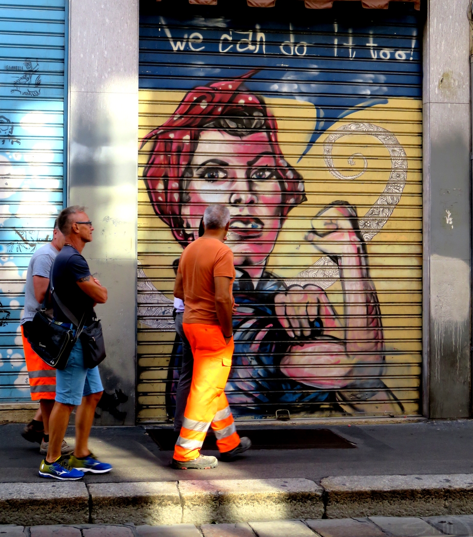 L'abbigliamento dell'uomo fa pensare a qualcuno impegnato in qualche servizio di sociale utilità,la donna del murale ha riconosciuto i suoi poco considerati meriti e lo incoraggia.Bella street!  _________________ Sergio Demitri https://www.flickr.com/photos/124946035@N02/ |