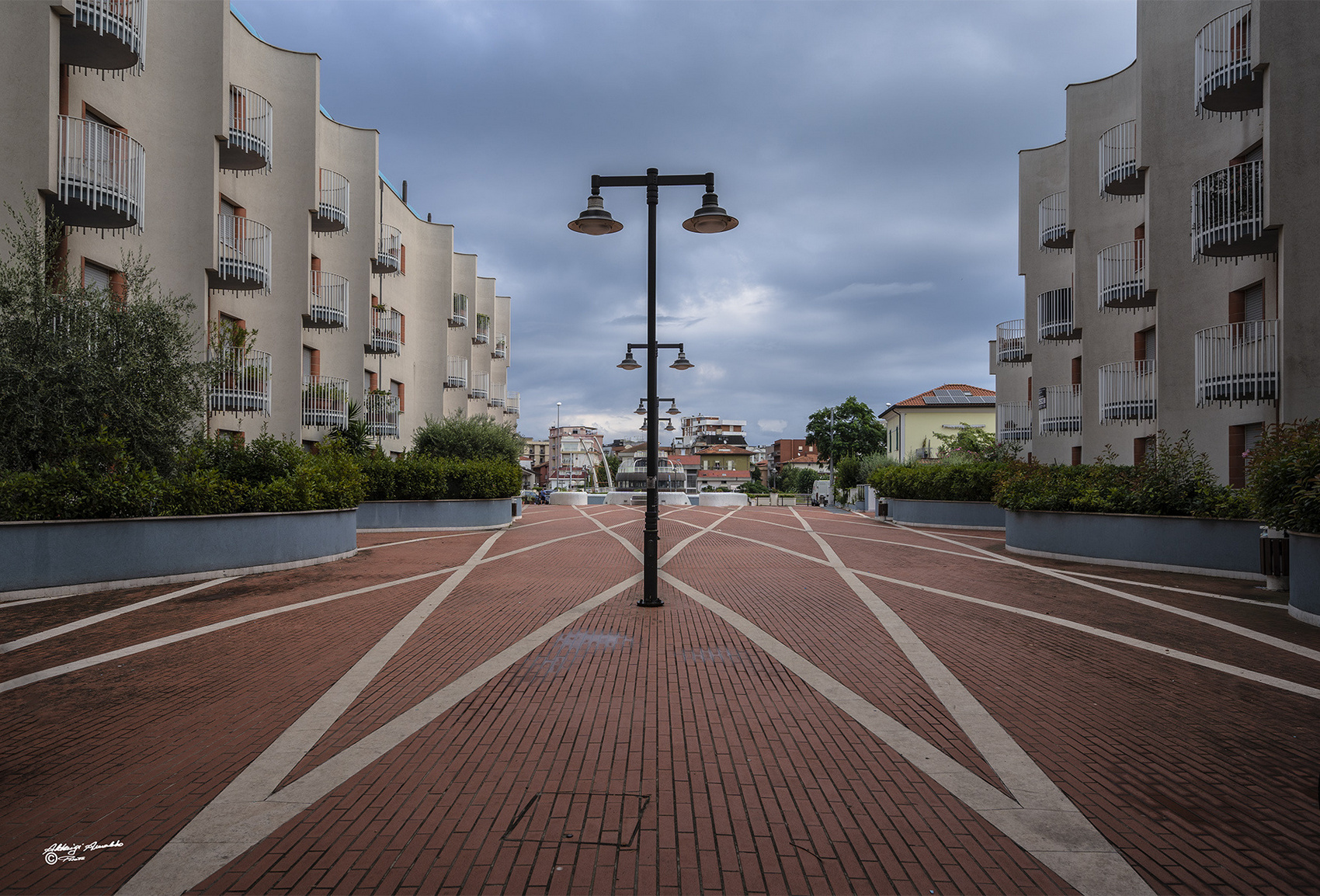 I due palazzi che si affacciano su questa piazza non sono equidistanti dal palo, e questo "rovina" un pochino il rigore che si necessita su questo tipo di scatti.