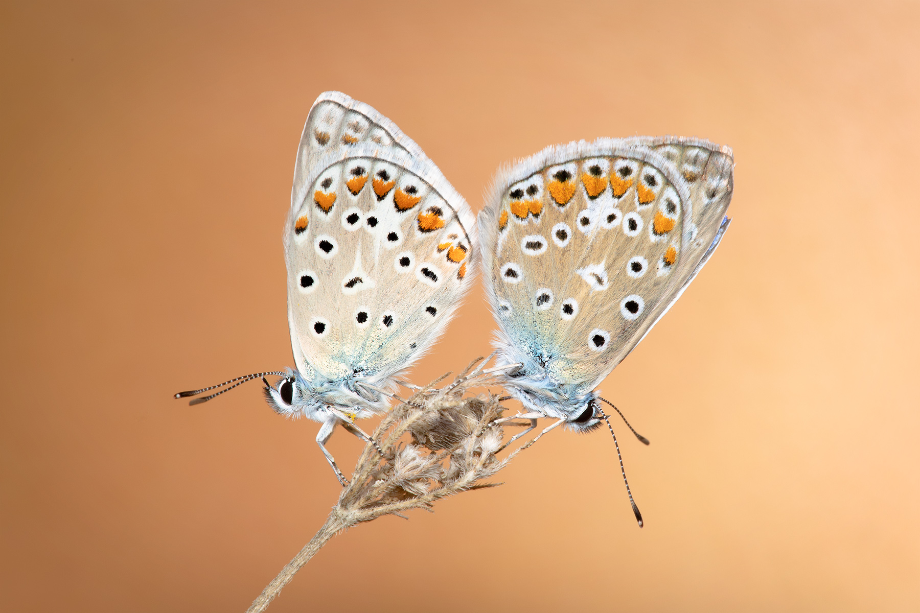 Un'ottima proposta, una doppia cattura ben eseguita...composizione a mio avviso validissima, quasi perfetto il parallelismo, infatti l dettaglio molto buono un poco va a scemare verso il vertice delle ali della licenide di sx. Sulla stessa abbasserei selettivamente la luminosità....bravo, stai migliorando a vista d'occhio.