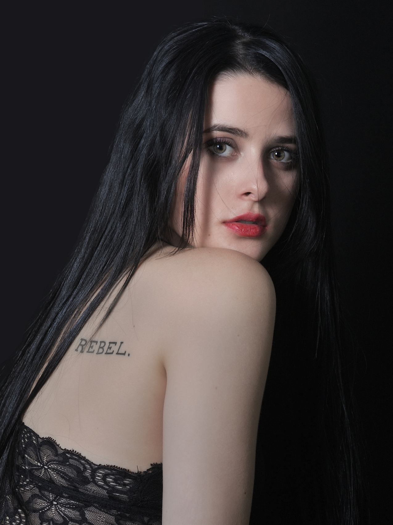Lei è sempre molto bella e buca lo schermo, ma personalmente (e da profano del genere) non amo molto lo sfondo nero che non fa emergere i capelli della modella, né la desaturazione radiale attorno al volto, che a mio gusto penalizza molto la resa dell'incarnato.