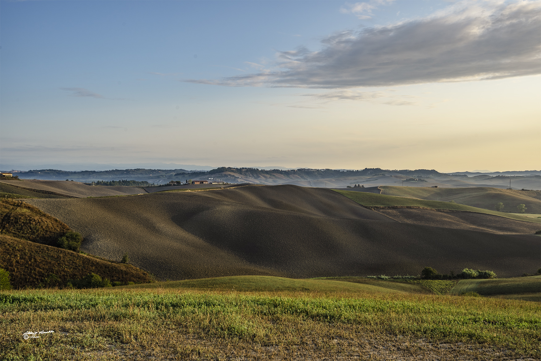 Mi piace molto la resa delle colline lavorate con questa magnifica luce del mattino, bella!