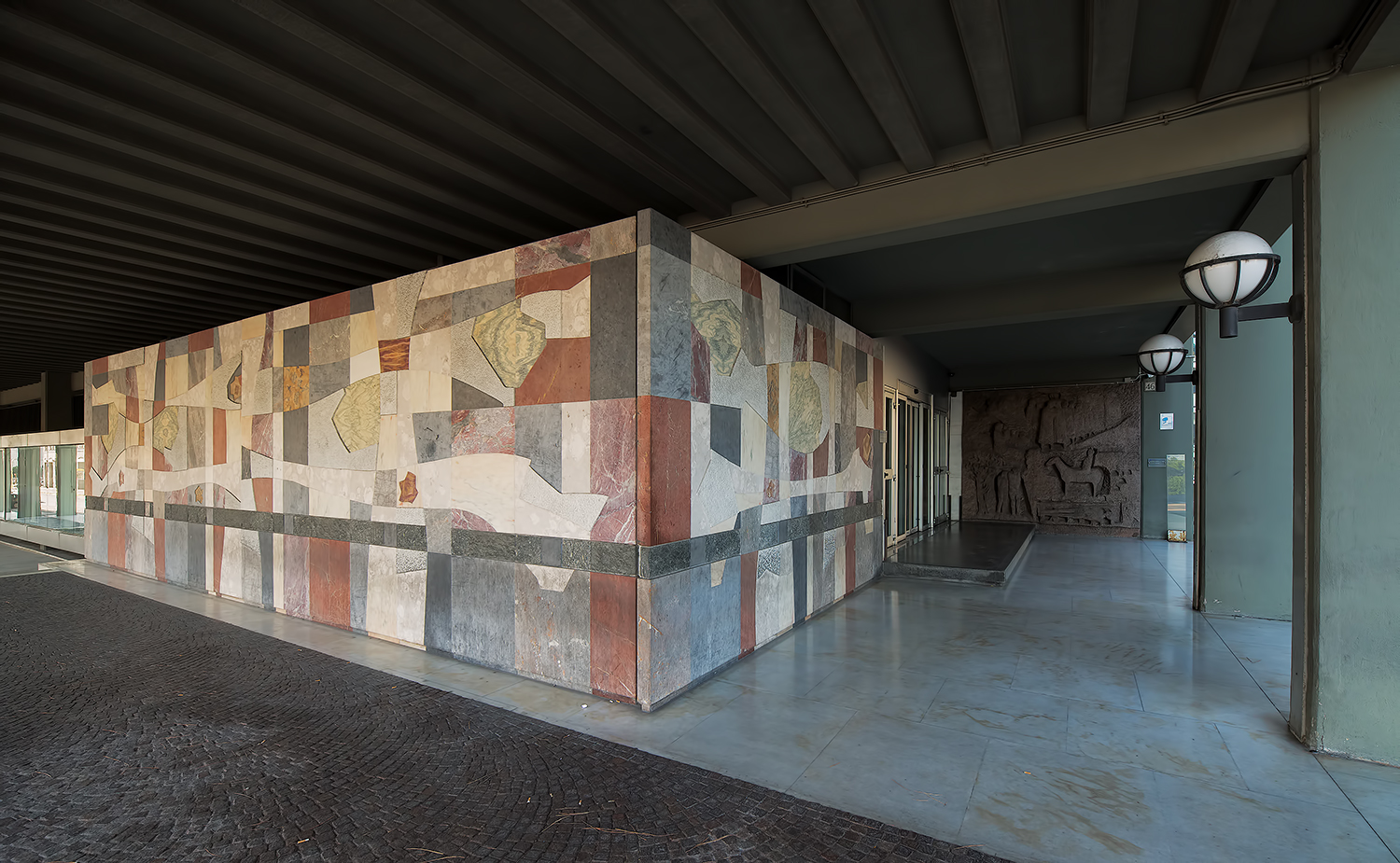 Il grandangolo spinto ha un po' stiracchiato i lampioni sferici: con tanta pazienza si potrebbe provare a recuperare localmente questo effetto, ma si tratta di una finezza che lascia il tempo che trova. Molto belle le pareti colorate, con questi motivi geometrici molto accattivanti.