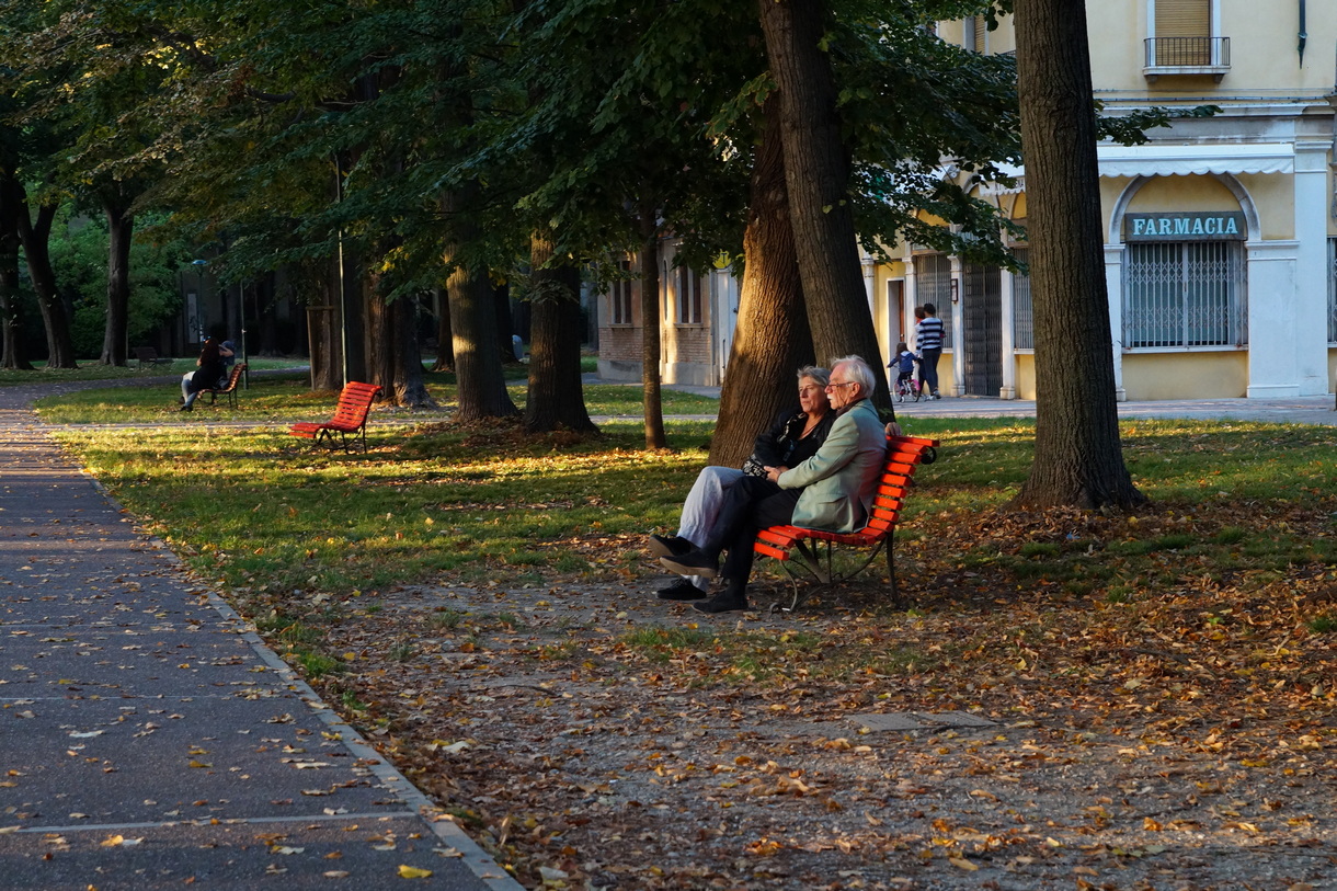 Una coppia in primo piano, 2 panchine rosse, una coppia laggiu' in fondo sulla sinistra, 3 persone, di cui una bambina dietro la coppia in primo piano, tante foglie autunnali, una bella luce radente, una via che interseca il parco, l'insegna della farmacia.