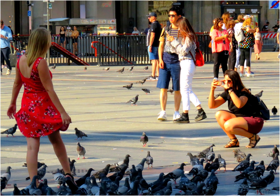Scena di comune vita turistica in piazza Duomo a Milano...