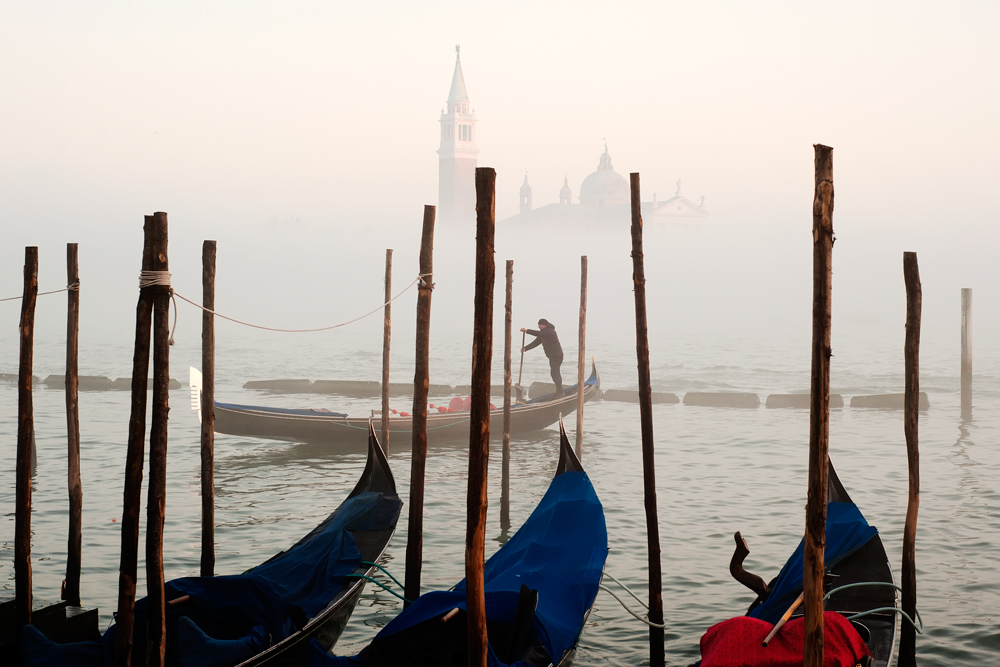 Difficile compositivamente inserire gondola e gondoliere in maniera più efficace di così! Ripresa suggestiva, la nebbia a Venezia regala sempre scatti fascinosi. Peccato per quella barriera che galleggia a protezione delle gondole a causa del moto ondoso, ovviamente tu non potevi farci niente ma dovrebbero pensare a qualcosa di meno impattante esteticamente