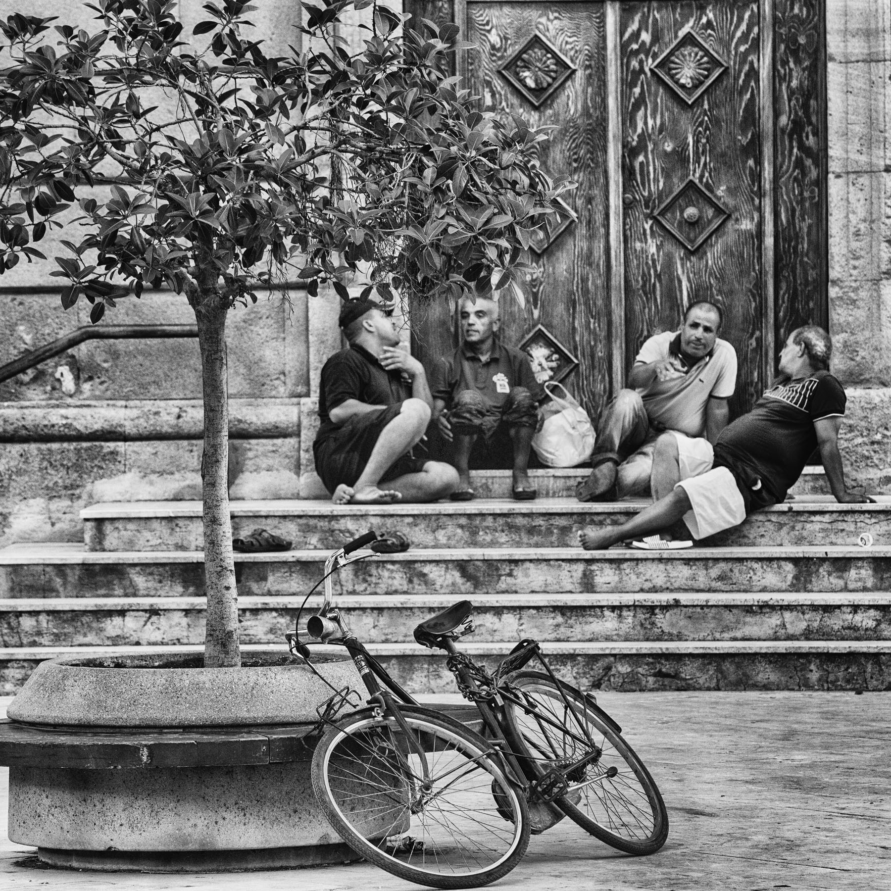La posizione della bici richiama la postura rilassata della figura sulla destra, forse il padrone. Ben sfruttata la quinta dell'albero. Scatto interessante. Un caro saluto Ciao