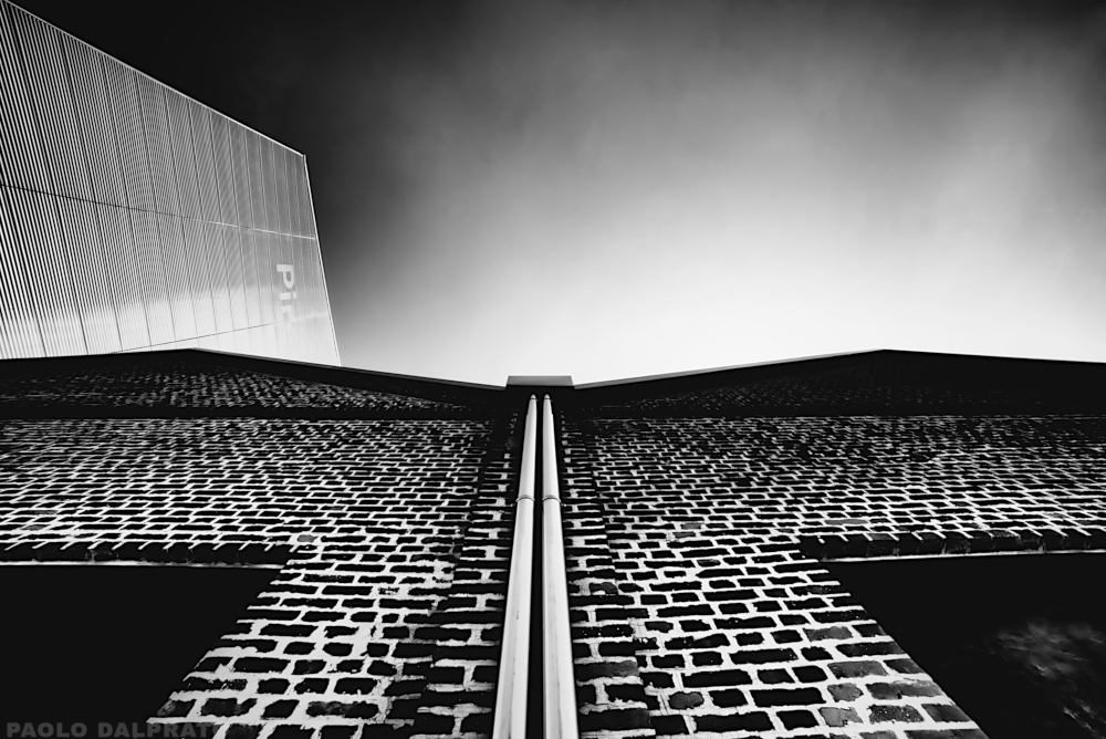 Linea dell'edificio moderno quasi perfettamente nello spigolo, tubi di gronda quasi perfettamente al centro frame, linea nera tra i tubi quasi perfettamente perpendicolare....