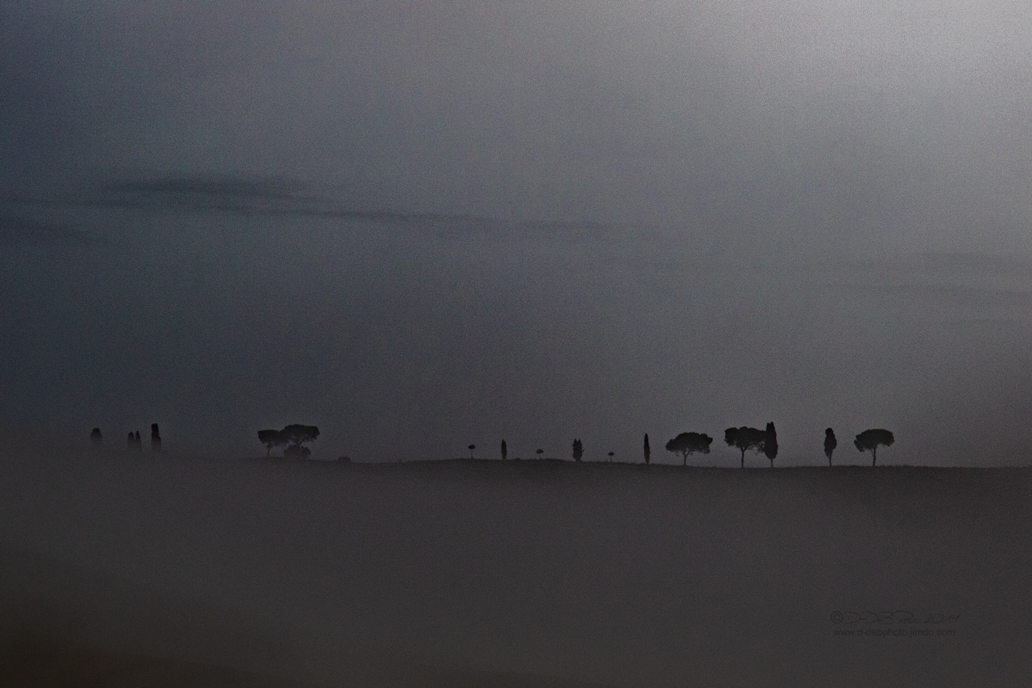 Questa ripresa misteriosa e minimale mi piace molto. Mi convince un po' di meno il trattamento: hai aggiunto tu la grana? Sono emersi anche degli aloni chiari attorno alle chiome in silhouette.