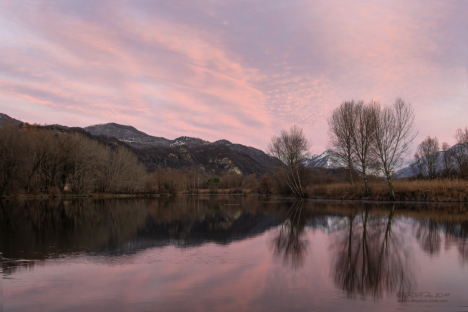 molto belli i colori dell'alba che tingono di rosa il cielo e il fiume, ottima anche la composizione.