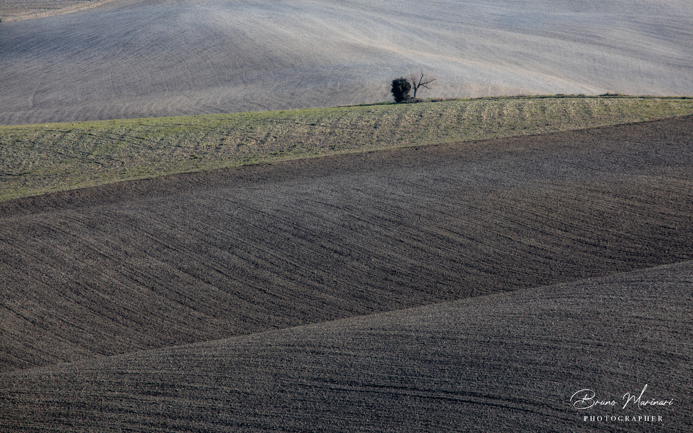 Se guardo ed analizzo questa fotografia trovo che é caratterizzata da un’estrema semplicità e pulizia. Questo sia per la composizione, per come è strutturata e per i cromatismi. Basta constatare che ci sono 5 elementi grafici e 2 colori (uno di un paio di tonalità). Stop, non c’è altro. Nulla d’altro perché qualcosa in più non sarebbe essenziale. 3 linee diagonali che in combinazione con le tonalità dei campi fanno si che il terreno risulti tridimensionale e non piatto e monotono o troppo uniforme. E poi due alberelli, uno spoglio, messi in posizione non centrale nel fotogramma che, seppur con la loro esiguità dimensionale, hanno un grande poso compositivo, svolgendo un ruolo di fulcro grafico e stagliandosi evidenti su uno sfondo ben più chiaro. Guardando la fotografia chi direbbe di primo acchito che è “fatta” da così poco ? Dote incontestabile di questo scatto è la capacità di essere esaustivo basandosi su una manciata di elementi grafici e cromatici che riescono, con grande pulizia e semplicità a “dire” tutto senza il bisogno di altro che correrebbe il rischio di essere superfluo. Complimenti.