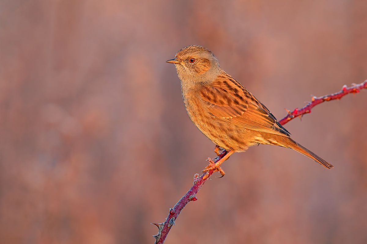 Data la brina sullo stelo spinoso direi alba... ed un'alba con luce caldissima, bella ma esageratamente rossa tanto da stravolgere le tonalità del piumaggio della scopaiola.