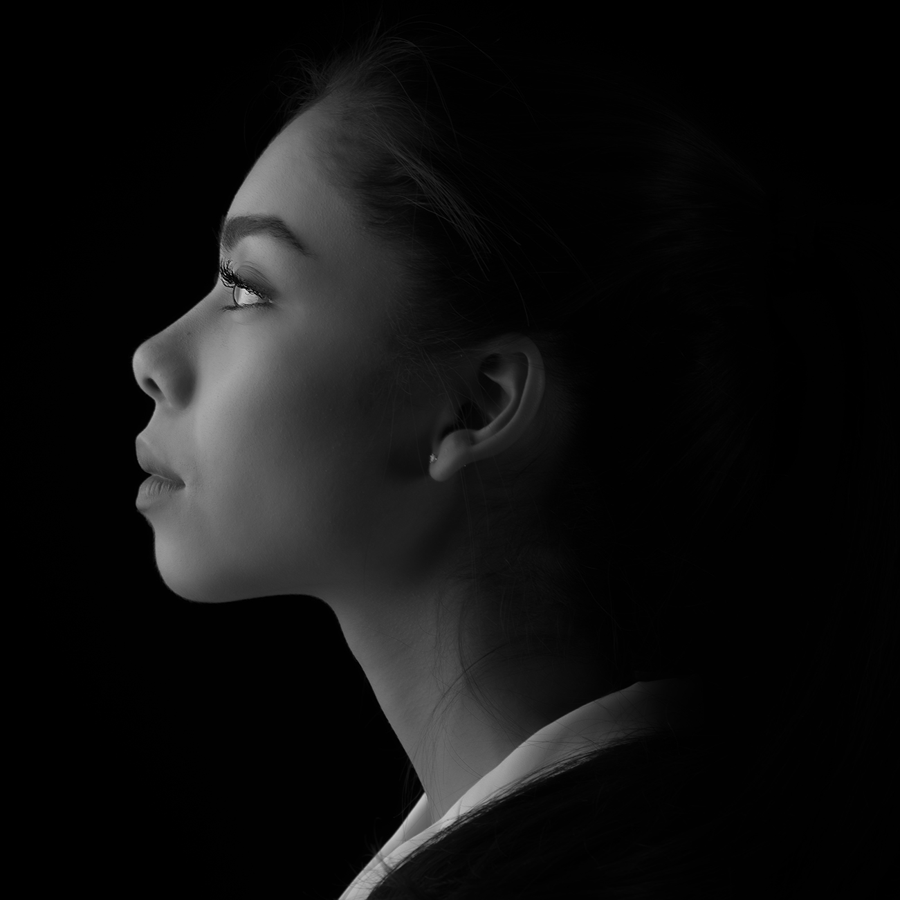 Una luce morbida disegna il morbido profilo di questa bella ragazza. Personalmente punterei a un pizzico di maggiore luminosità delle zone in luce in modo da diminuire un grigiore che non mi convince molto mentre mi piace la scelta di far affogare il capo nel nero di fondo.