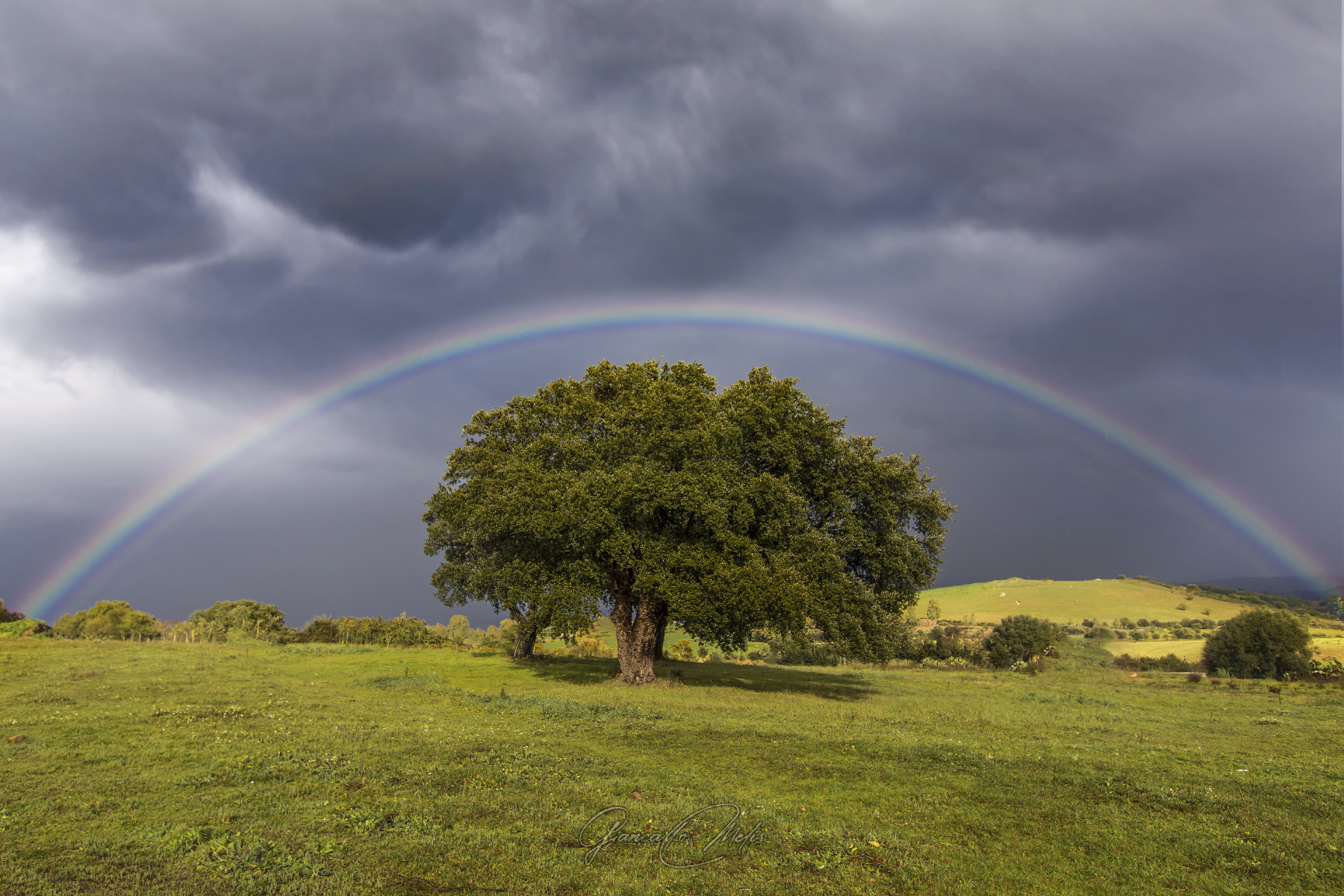 La luce sulla parte bassa è fantastica che rende il verde brillante. Il tutto, con l'albero centrale sotto la cupola di questo bell'arcobaleno che sembra voler proteggere queste terre dal cielo cupo incombente.