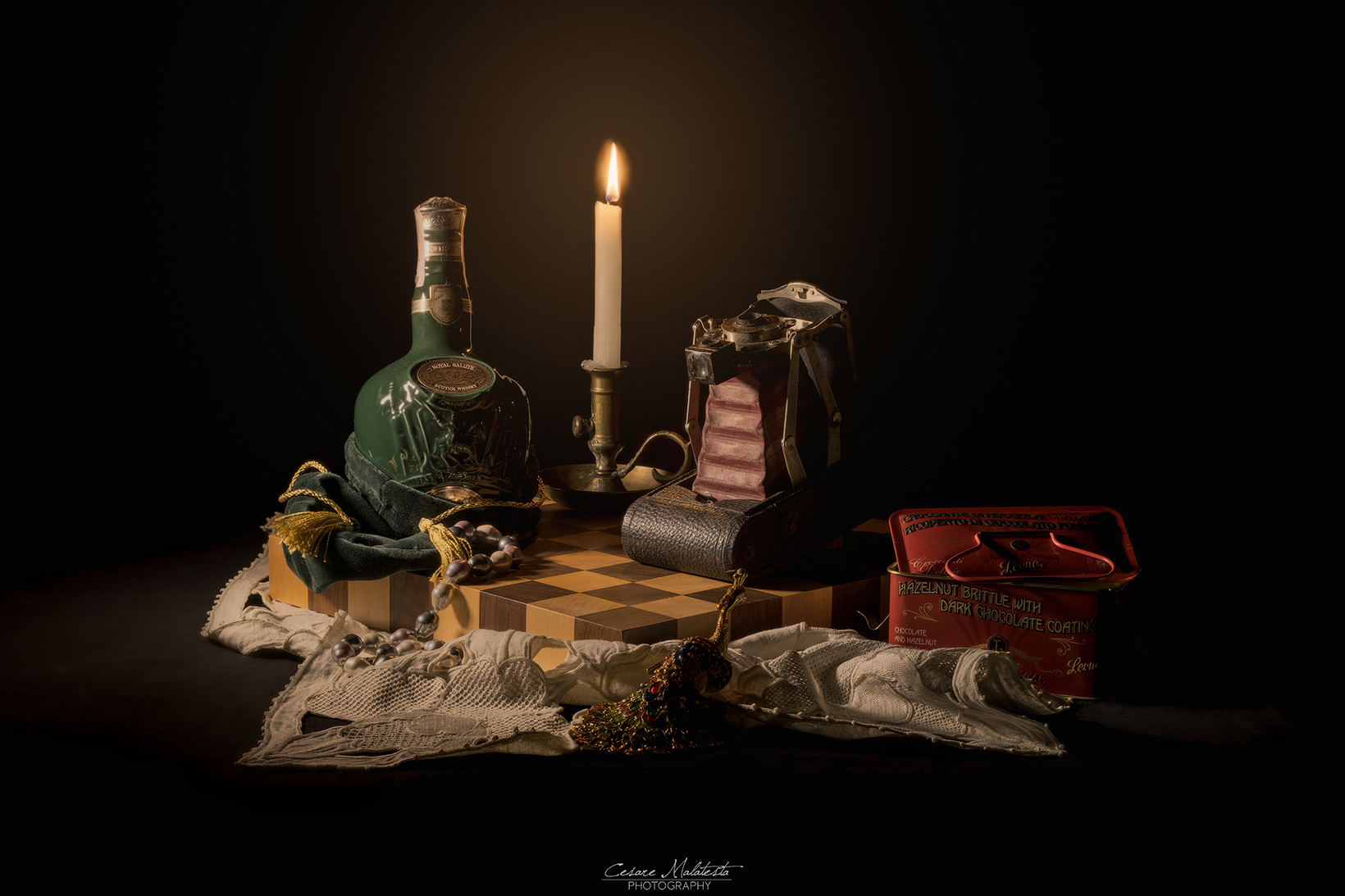 Ci vedo troppi elementi che non si abbinano tra di loro, sarebbe bastata la vecchia macchina fotografica e al limite la dama, comunque la qualità non si discute come anche la luce, oltre alla candela ovviamente  |