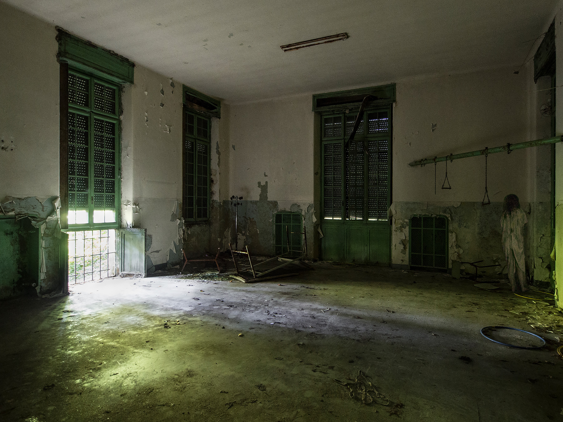 La foto ritrae quel che resta di una palestra all'interno del padiglione per i bambini di un ospedale psichiatrico dismesso. La "Presenza" arriva invece da un film di qualche anno fa, "ESP - Fenomeni paranormali", ambientato anch'esso in un vecchio manicomio; una pellicola non indimenticabile ma interessante soprattutto per la location.
