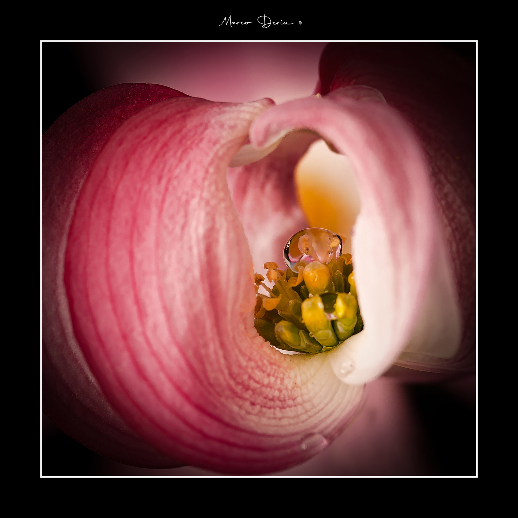 E' un fiore di una pianta stupenda che si trova nel mio giardino, il Cornus Florida, in realtà qui il fiore non è completamente aperto, una volta aperto rimangono i quattro petali come una margherita, però mi ha attirato la sua forma particolare ed ho composto con un po' di difficolta la goccia al suo interno e svariati tentativi per evitare una serie di riflessi che rendevano la goccia troppo marcata.