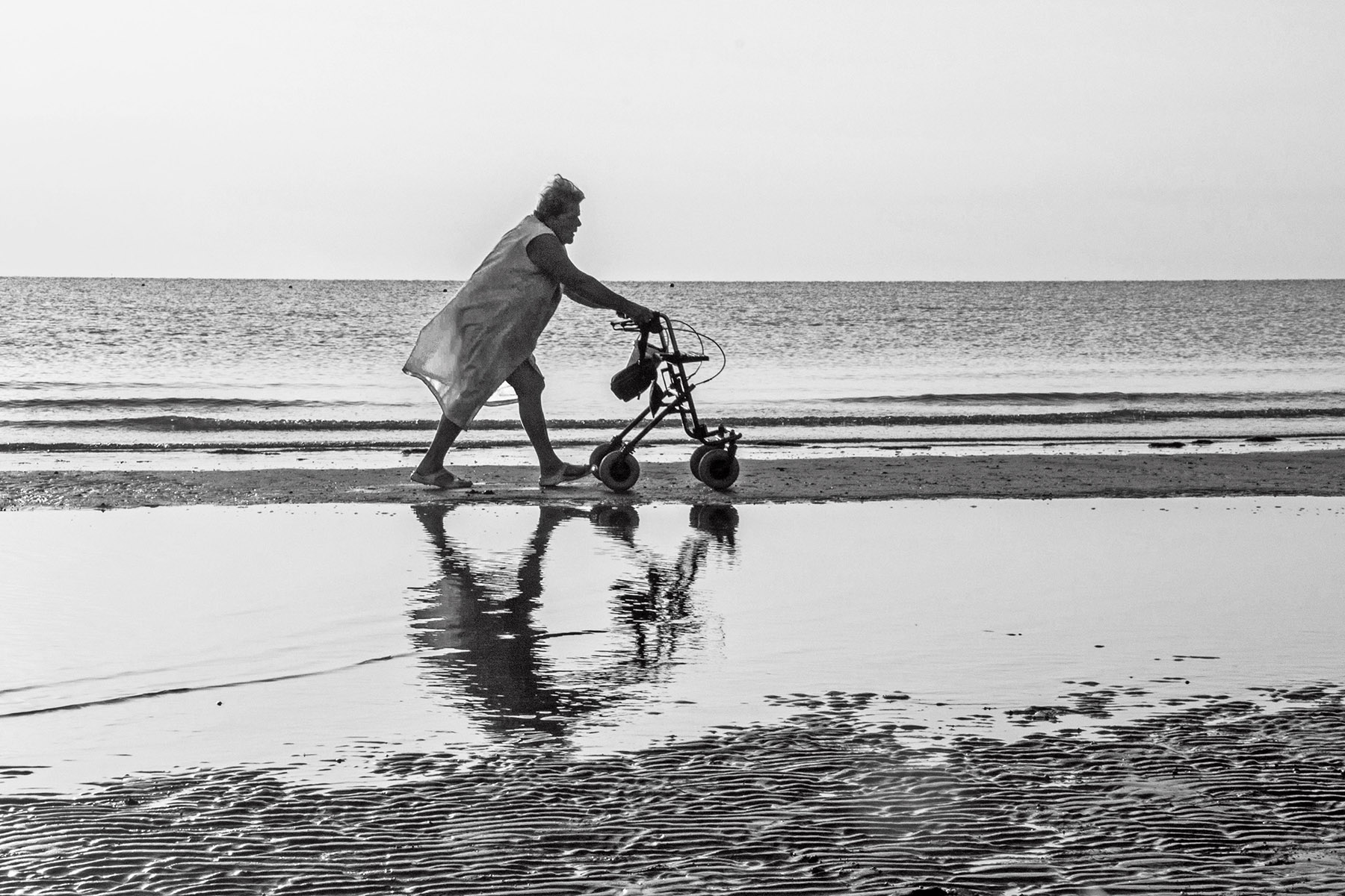 Ottimo soggetto colto al momento giusto con la falcata delle gambe in piena apertura. Il girello della signora veicola bene il significato. Piacevole la composizione che include il riflesso.