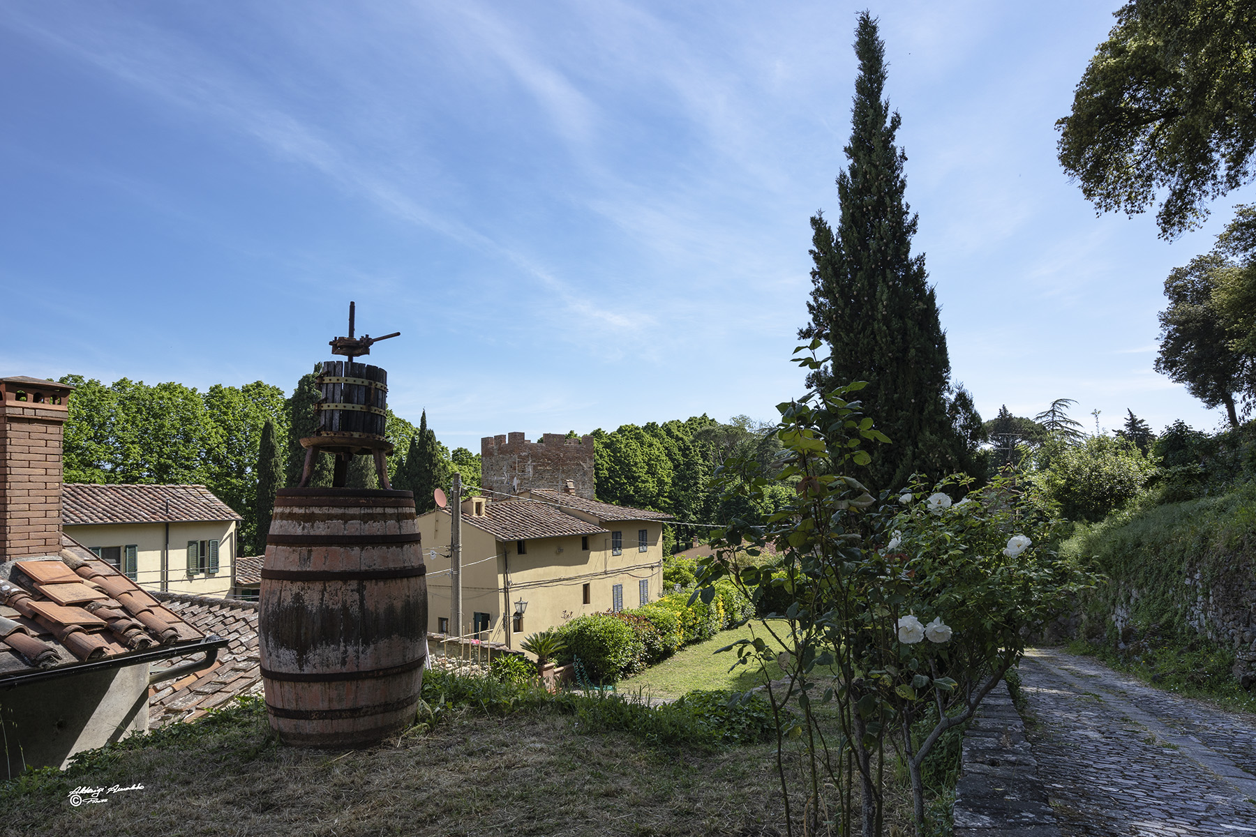 Composizione un po' confusionaria. Non si capisce se il centro di interesse è il barile, il castello, il cipresso o la stradina.