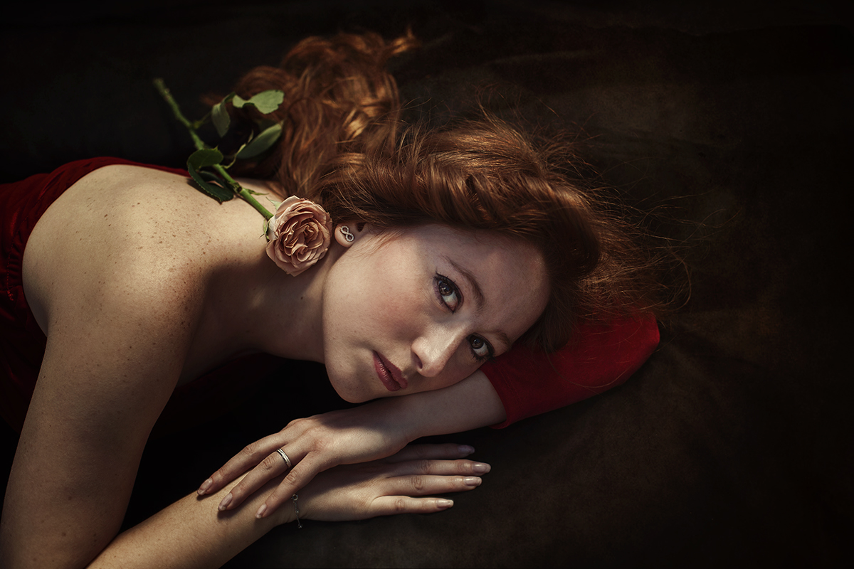 Trovo che le cromie date dai capelli rossi e dell'incarnato siano straordinarie così come l'impronta classica che hai voluto dare all'insieme.