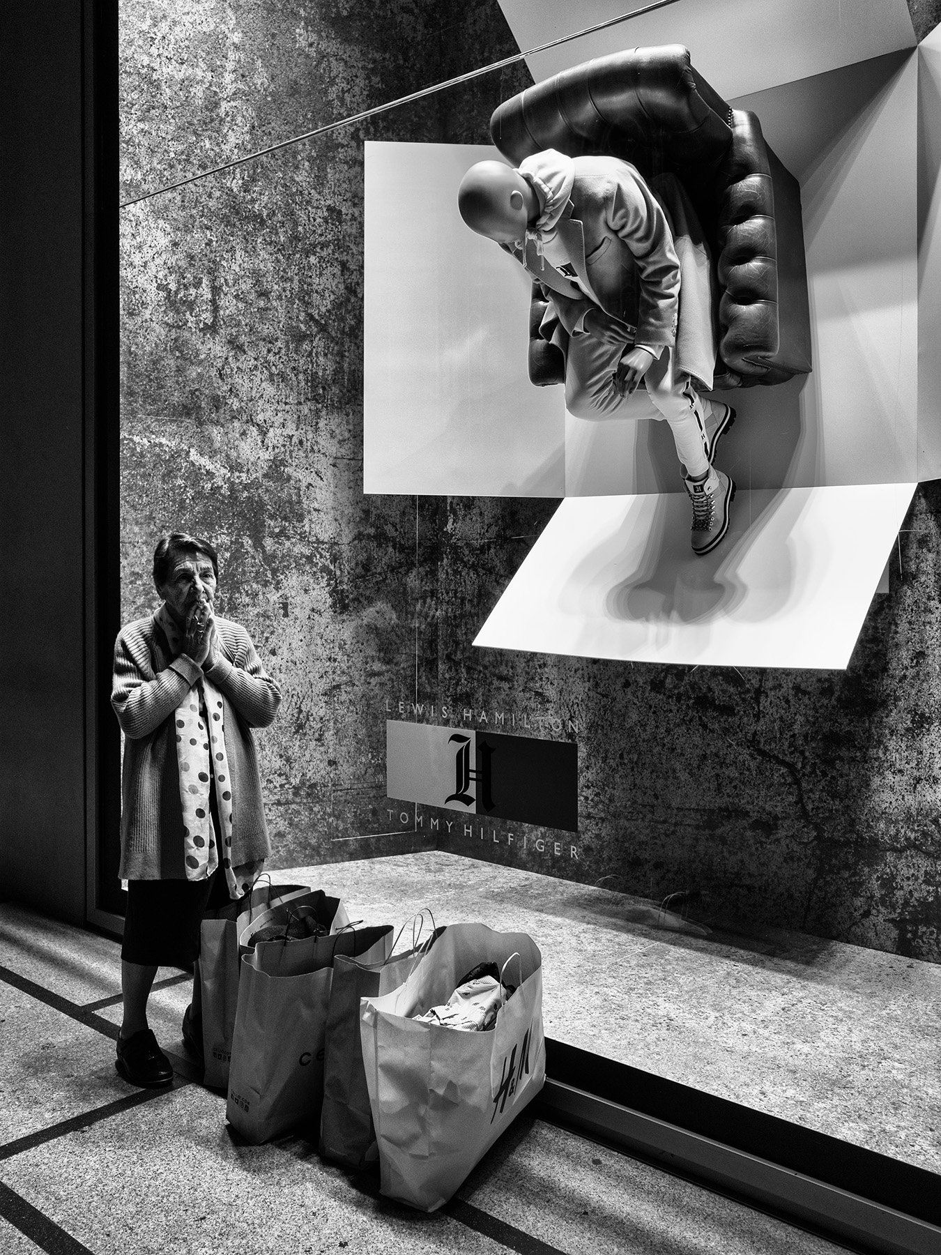 L'improbabile e precaria posizione del soggetto dell'istallazione e l'atteggiamento di ansia della donna creano una notevole tensione visiva ed emotiva che non si può non collegare alle attuali vicende.Bellissimo scatto,ottimi bn e composizione. Ciao,Sergio.