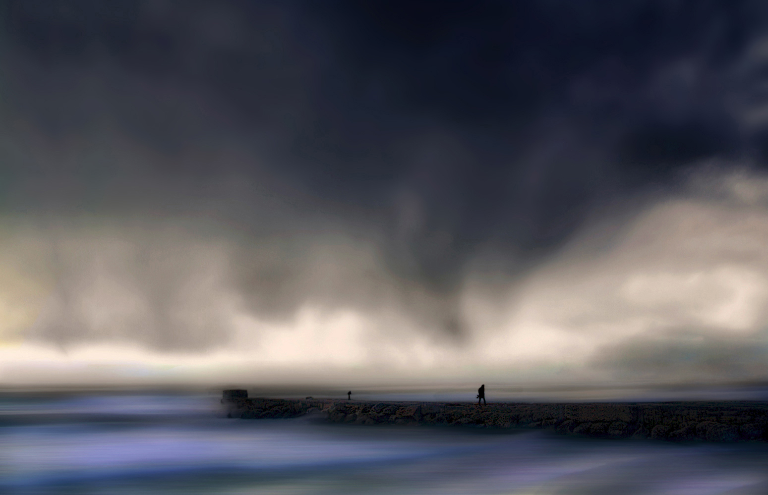 Lo vedo solo come un lavoro grafico. Allora avrei osato. Clonando gli oggetti neri sul fondo del pontile e poi prolungando le nuvole scure fino sopra alla testa del signore. A fare vedere che il temporale gli esce dai pensieri.